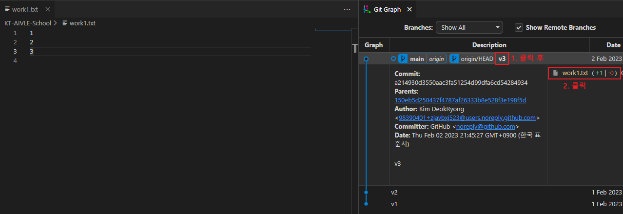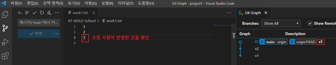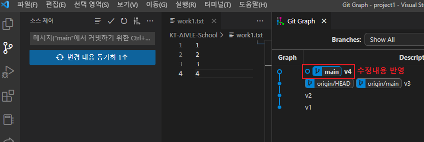 4. Git Graph를 통해 어떤 부분이 수정 되었는지 확인해보자