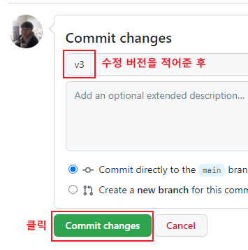 2. 파일 수정하기를 눌러서 코드를 수정(= 새로운 버전 만들기)