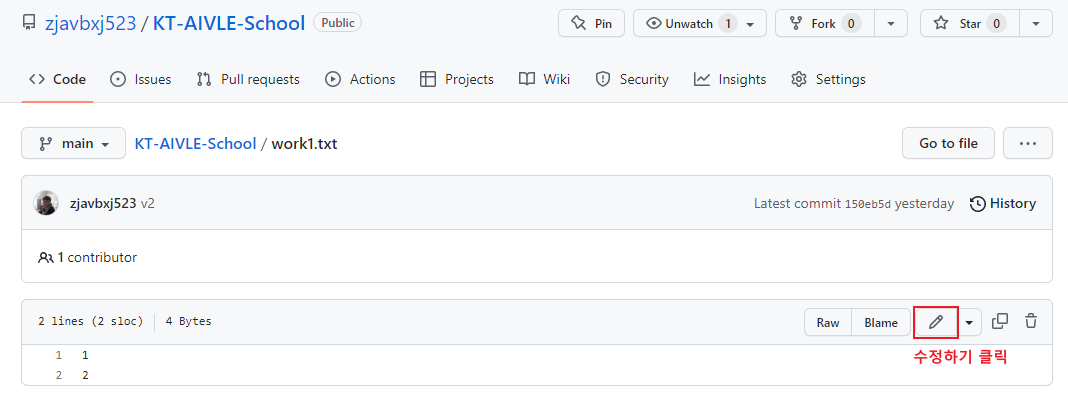 현재 원격 저장소(깃허브 레포지토리)에서 코드를 수정했다.