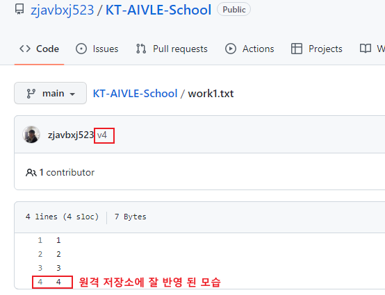 로컬 저장소에서 만든 새로운 버전이 원격 저장소에도 잘 반영 된 것을 확인 할 수 있다.